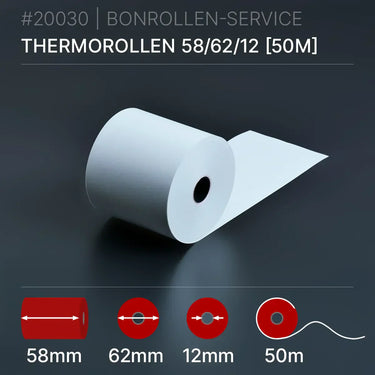 Thermorollen 58x62x12 (50m): weiße Thermorolle, 50m lang, 62mm Kern, 12mm Innendurchmesser