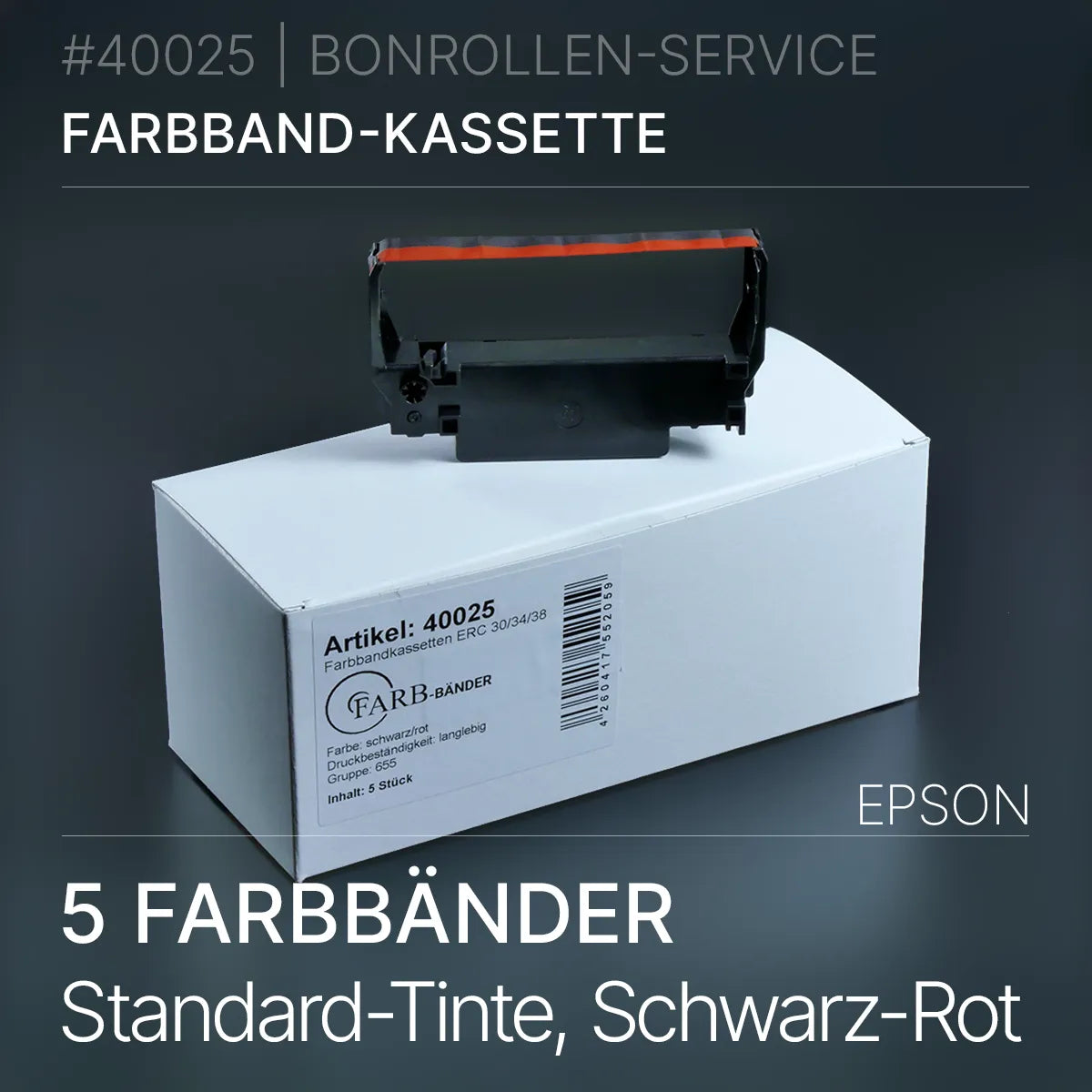 Unsere Farbband-Kassetten ERC 30/34/38, Gruppe 655 entsprechen sowohl den gesetzlichen Vorgaben als auch den technischen Spezifikationen der Gerätehersteller. Die Bandfarbe Schwarz/Rot sorgt für klare und gut lesbare Drucke. Das Druckbild ist langlebig, was eine dauerhafte Lesbarkeit gewährleistet.