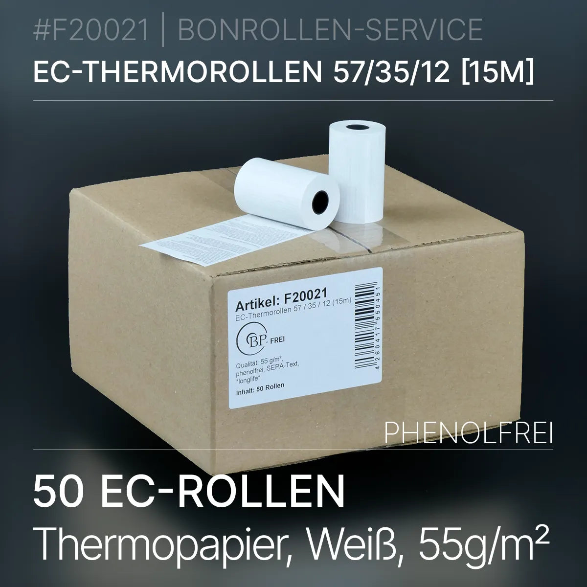 Verpackungseinheit mit 50 phenolfreien Thermorollen 57 / 35 / 12 in 10-Jahres-Qualität