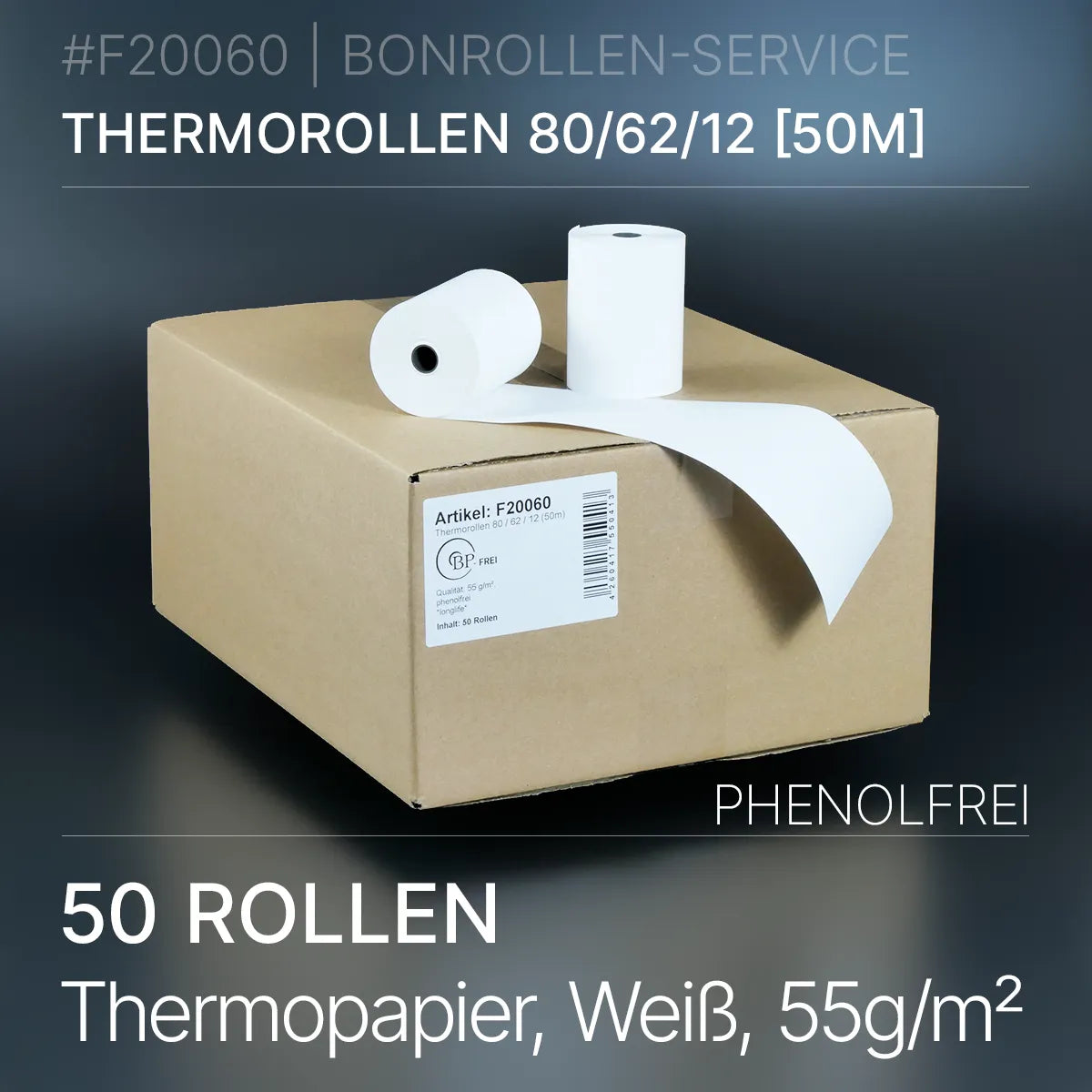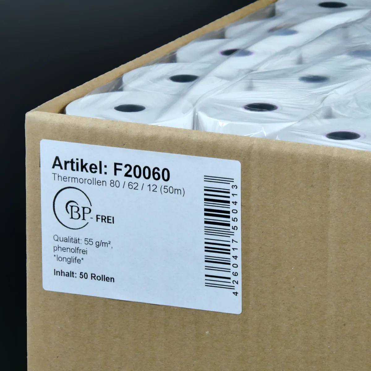 Verpackungseinheit mit 50 phenolfreien Thermorollen 80 / 62 / 12 in 10-Jahres-Qualität