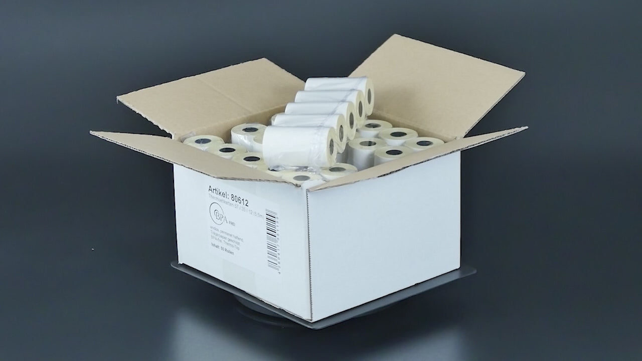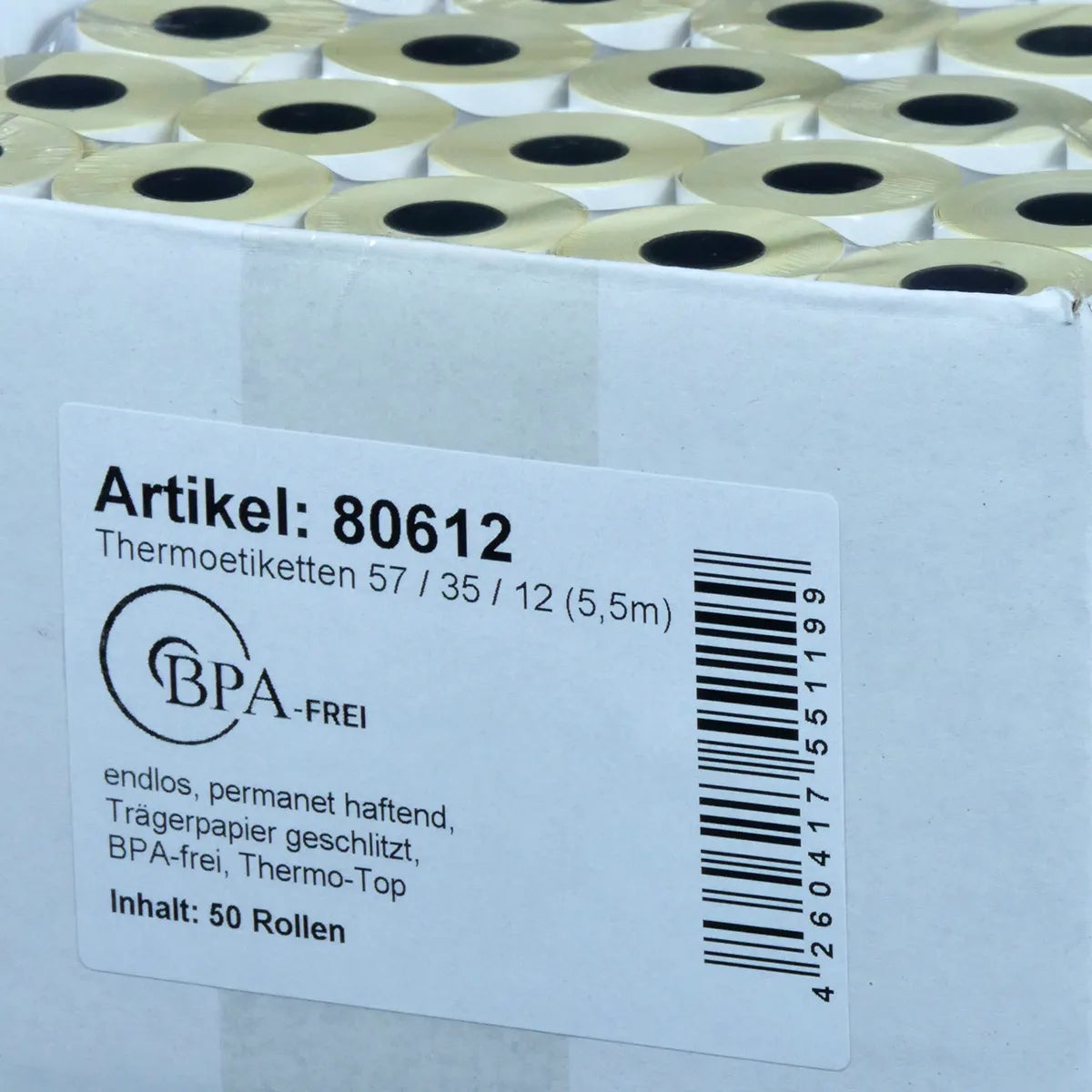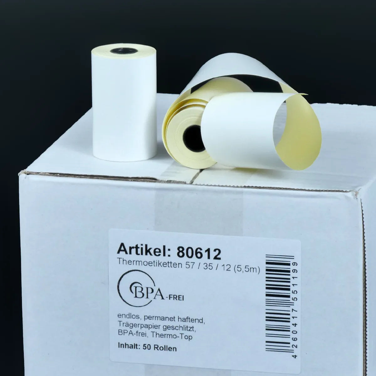 Produktdaten für Rollen 57/35/12 mit Etiketten 57mm x 5,5m aus Thermopapier - Thermo-TOP, BPA-frei