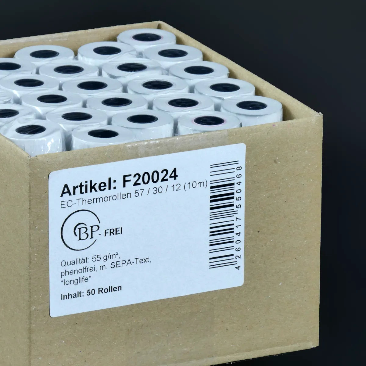 Verpackungseinheit mit 50 phenolfreien Thermorollen 57 / 30 / 12 in 10-Jahres-Qualität