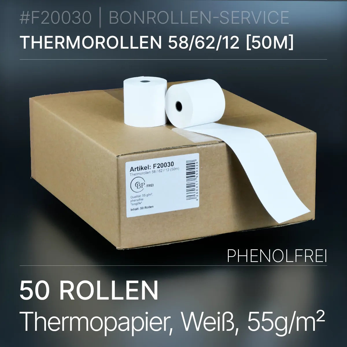 Verpackungseinheit mit 50 phenolfreien Thermorollen 58 / 62 / 12 in 10-Jahres-Qualität
